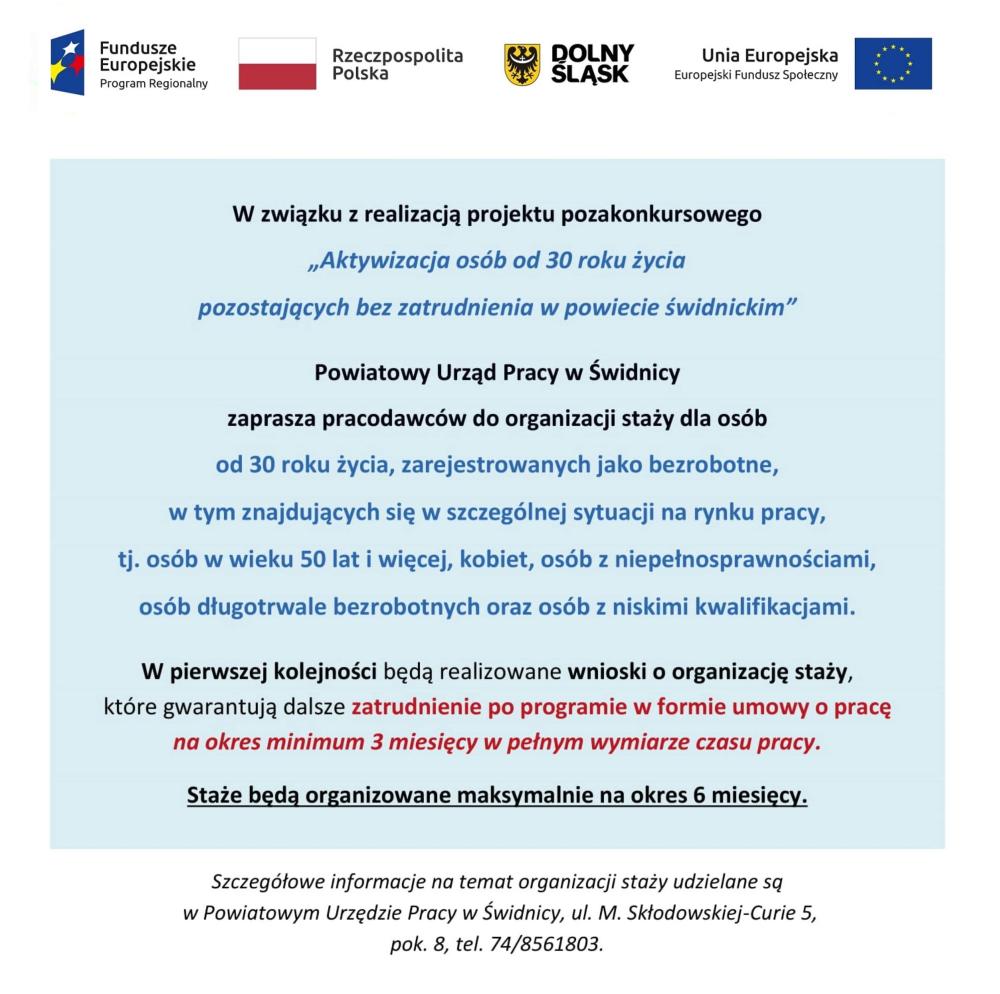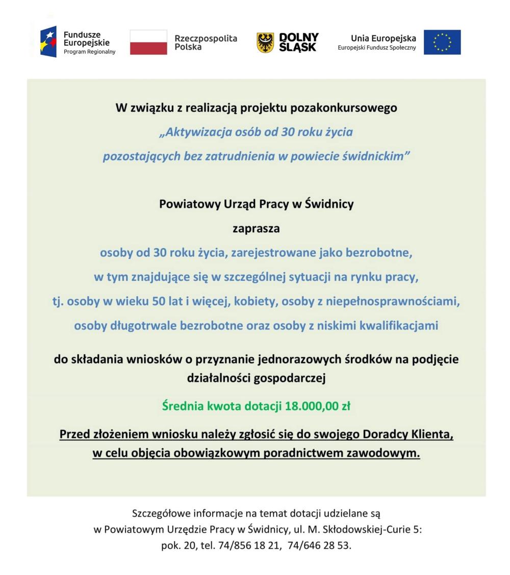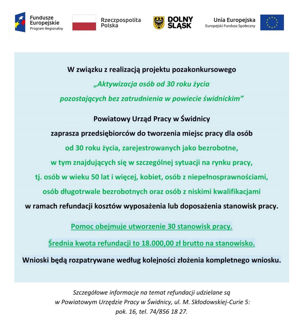 Informacji o projekcie udziela Pani Monika Krystkowiak – tel. 74/8561822, pok. 8 siedziba Powiatowego Urzędu Pracy w Świdnicy, ul. Marii Skłodowskiej-Curie 5.