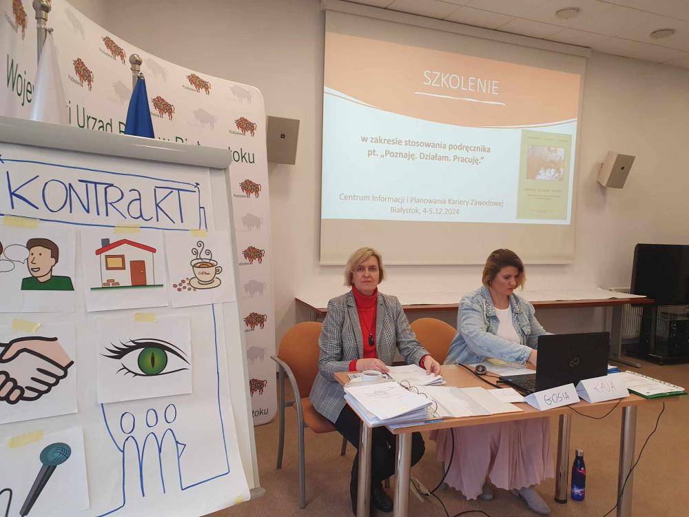 W dniach 4-5 grudnia 2024 r. w Wojewódzkim Urzędzie Pracy w Białymstoku odbyło się szkolenie doradców zawodowych z powiatowych urzędów pracy województwa podlaskiego. Uczestnicy szkolenia mieli okazję zapoznać się z wybranymi narzędziami i ćwiczeniami, zebranymi w podręczniku „Poznaję. Działam. Pracuję", przygotowanym na zlecenie Ministerstwa Rodziny, Pracy i Polityki Społecznej.
